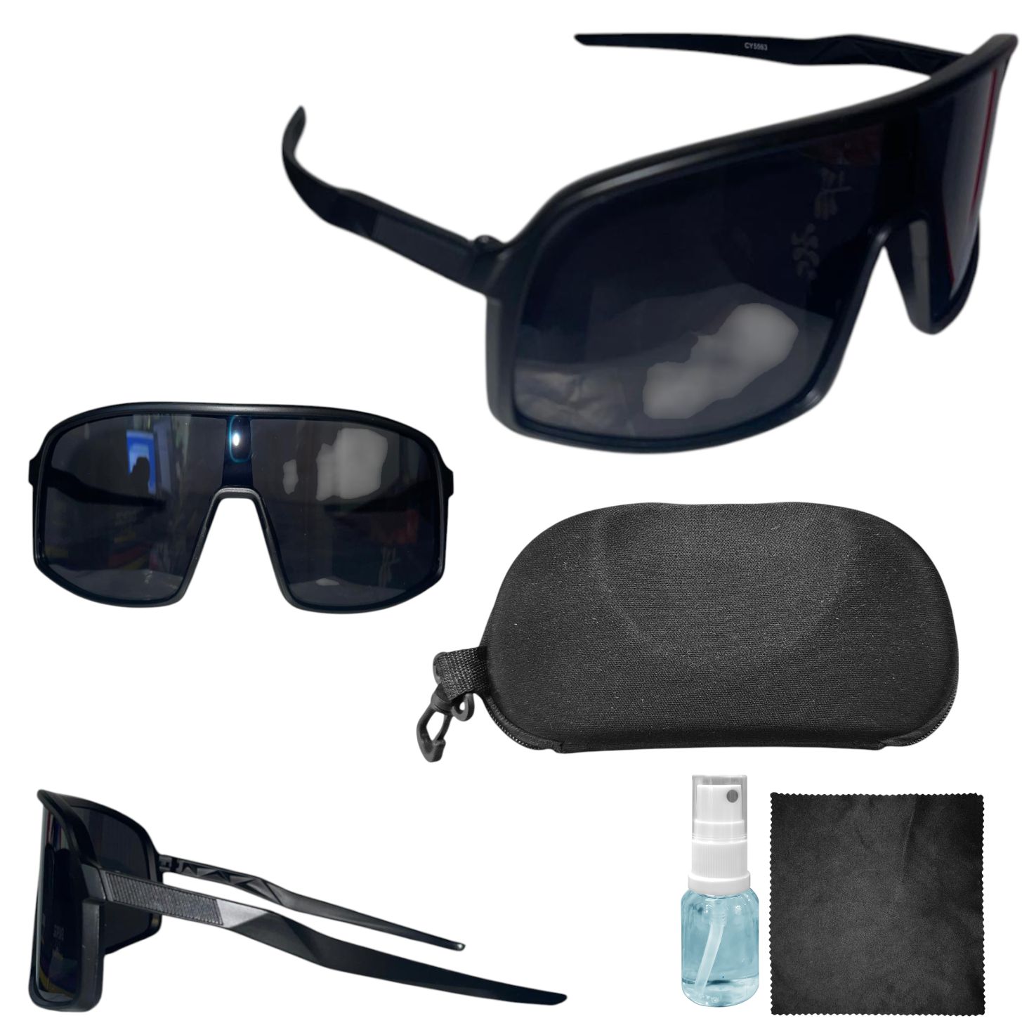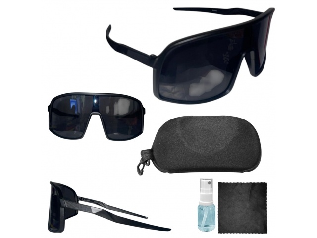 Kit de Lentes de Ciclismo con estuche rígido, franela y líquido limpiador. Todo lo que necesitás para mantener tus gafas en perfecto estado.