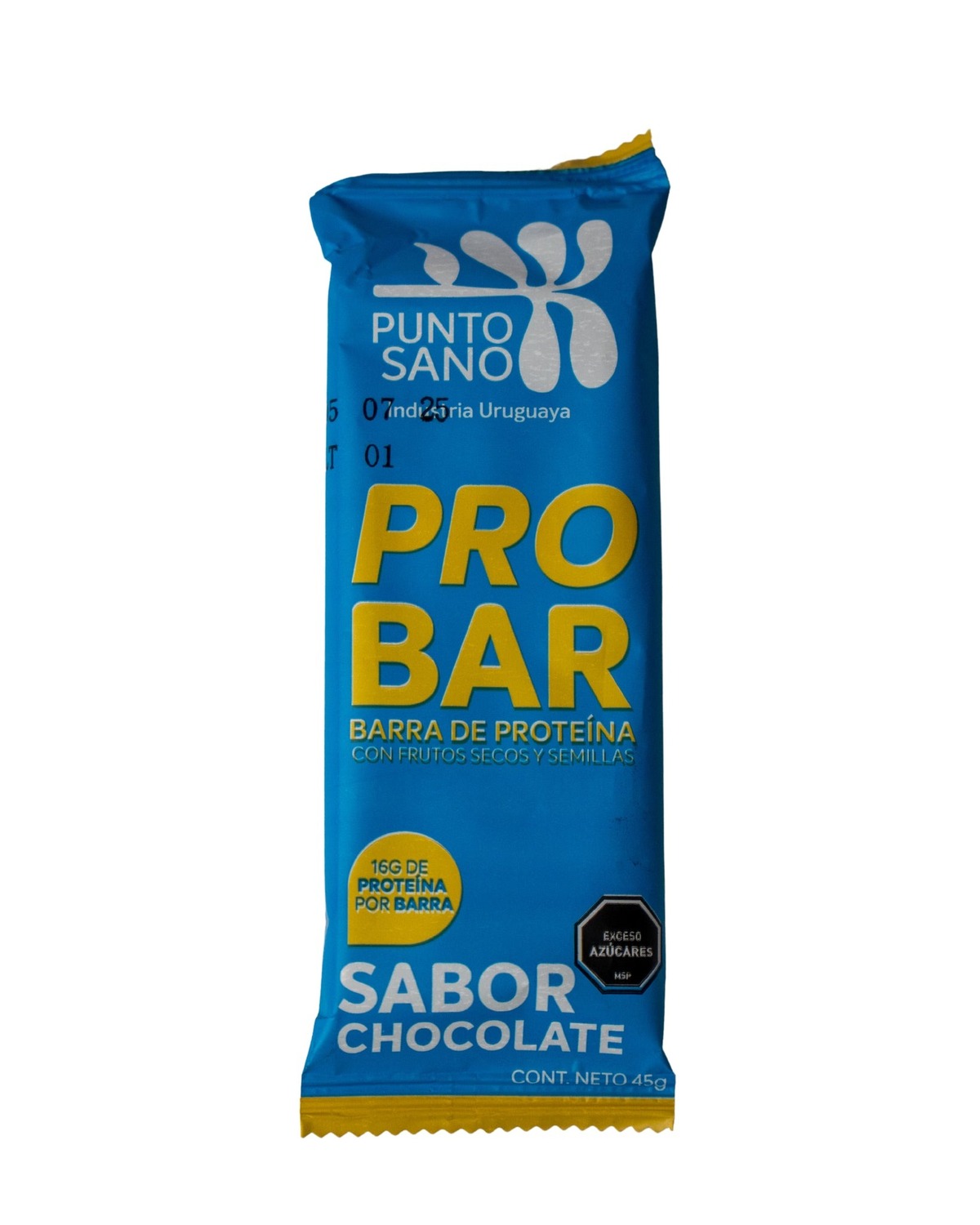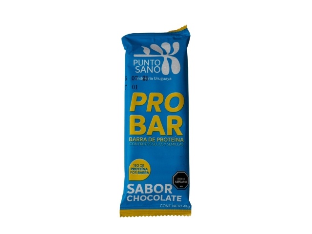 La barra de proteína PRO BAR de Punto Sano sabor chocolate está elaborada con una combinación de frutos secos y semillas que aportan textura y nutrientes, más 16g de proteína por unidad. Es ideal para deportistas, colaciones o para quienes buscan un snack energético con sabor intenso. Producto uruguayo de 45g. Advertencia: contiene exceso de azúcares según MSP.