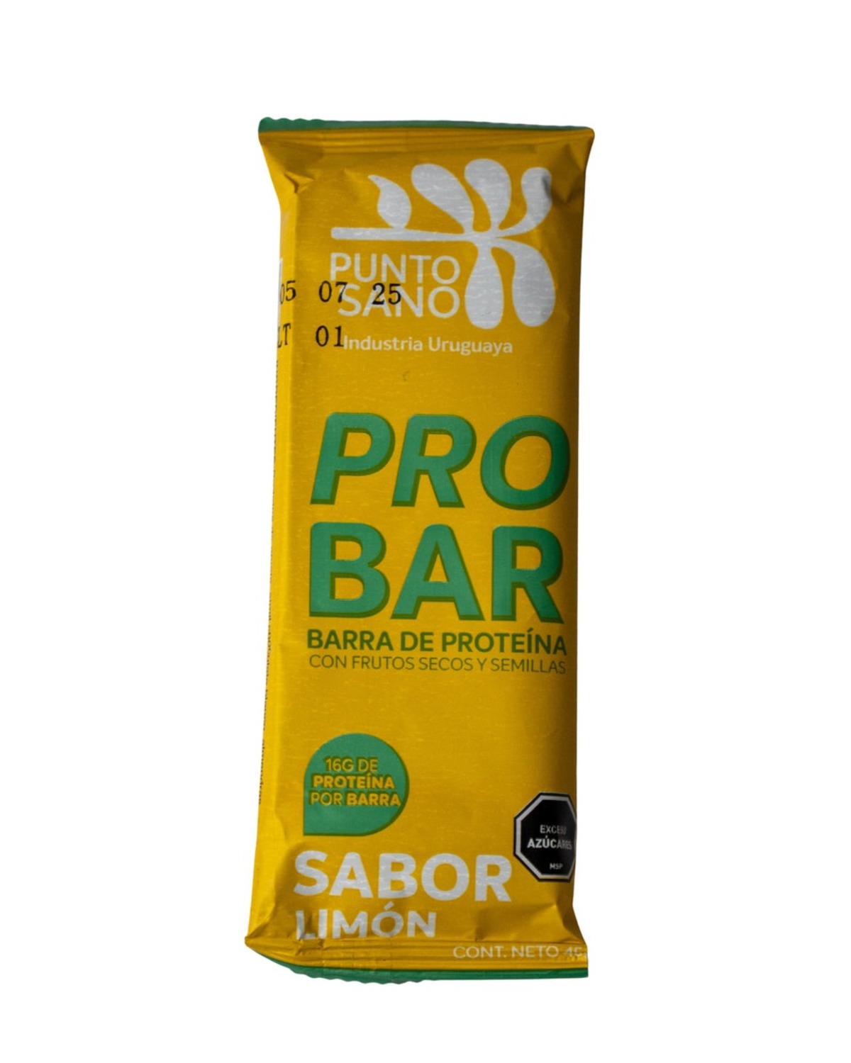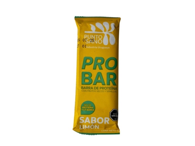 La barra de proteína PRO BAR de Punto Sano sabor limón es una opción ideal para quienes buscan una fuente rica en proteína con un perfil refrescante. Contiene 16g de proteína por unidad, además de frutos secos y semillas. Con 45g, es perfecta para consumir como snack post entrenamiento o entre comidas. Industria uruguaya. Advertencia: contiene exceso de azúcares según MSP.