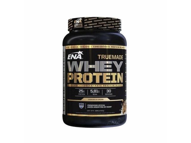ENA TrueMade Whey Protein sabor crema y cookies está formulada con proteínas de suero aislada (WPI) y concentrada (WPC), entregando 25g de proteína por porción, junto con 5.8g de BCAA y 5.7g de glutamina. Ideal para consumo post entrenamiento, su fórmula sin azúcar añadida y de rápida absorción contribuye a la recuperación muscular y desarrollo de masa magra. Presentación de 930g. Rinde 30 servicios. Sabor cookies & cream.
