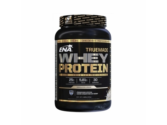 ENA TrueMade Whey Protein sabor crema de vainilla aporta 25g de proteína por porción, junto con 5.8g de BCAA, ayudando a recuperar, mantener y desarrollar masa muscular. Su fórmula combina suero concentrado y aislado de alta pureza, sin azúcares agregados ni ingredientes artificiales. Ideal para consumir después del entrenamiento o como parte de una alimentación deportiva balanceada. Contenido neto: 930g. Rinde 30 porciones.